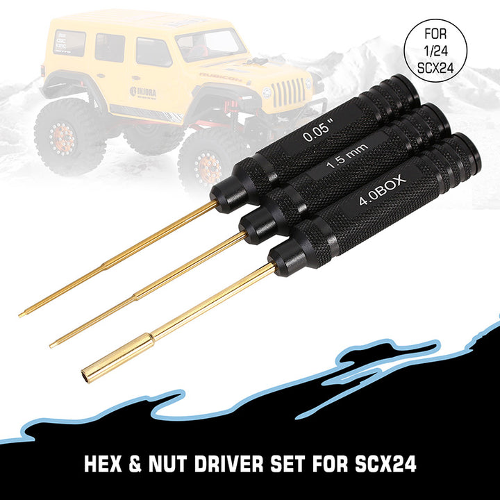 - INJORA RC tool kit include 0.05in 1.5mm hex screwdrivers, 4.0 box nut driver, to allow you to replace parts faster on SCX24