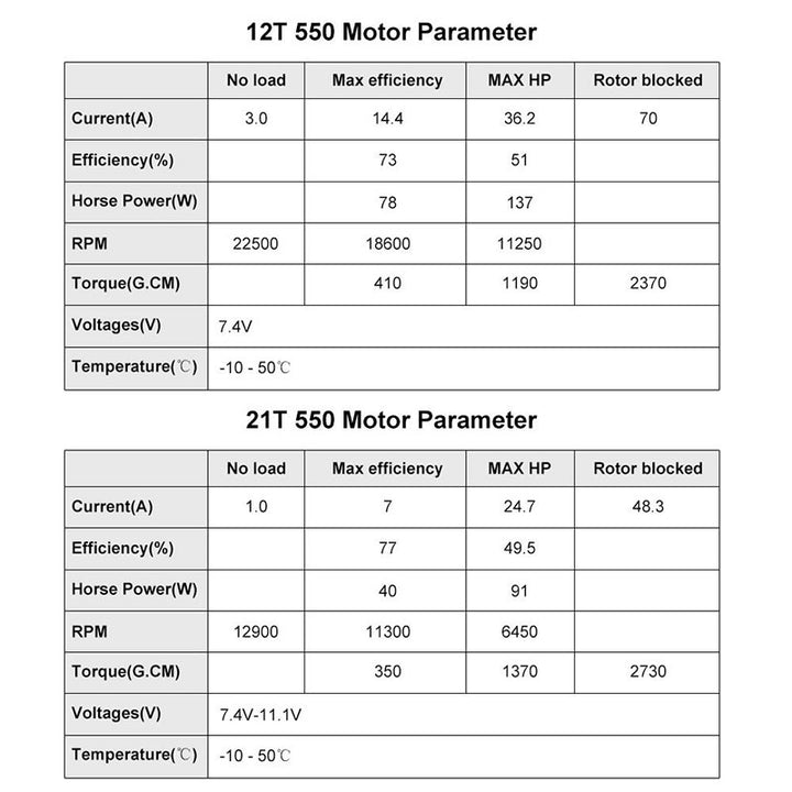 Remarks: "T" mean the number of turns. 12T and 21T motors fit high speed RC Car. 29T 35T motors fit large torque RC Crawler.