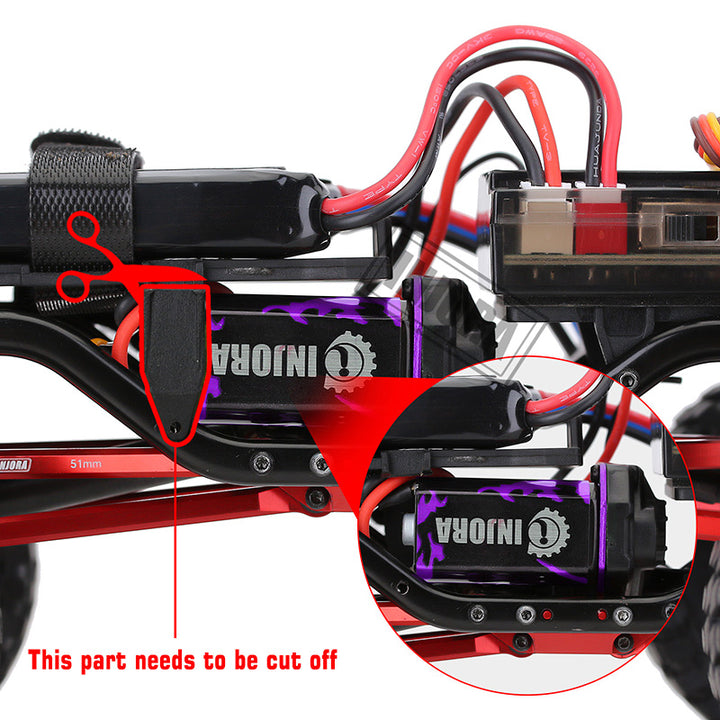 - 050 motors are longer than stock motor, so one of the battery tray posts needs to be cut off to fit.