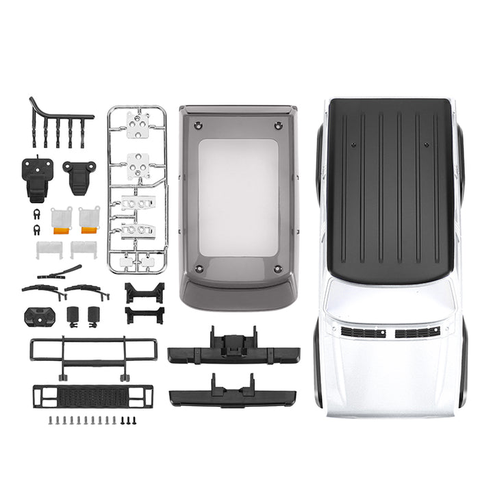 - Includes grille, side mirrors, door handles, fender flares, windshield wipers, spare tire mount, front rear bumpers, clipless mounting