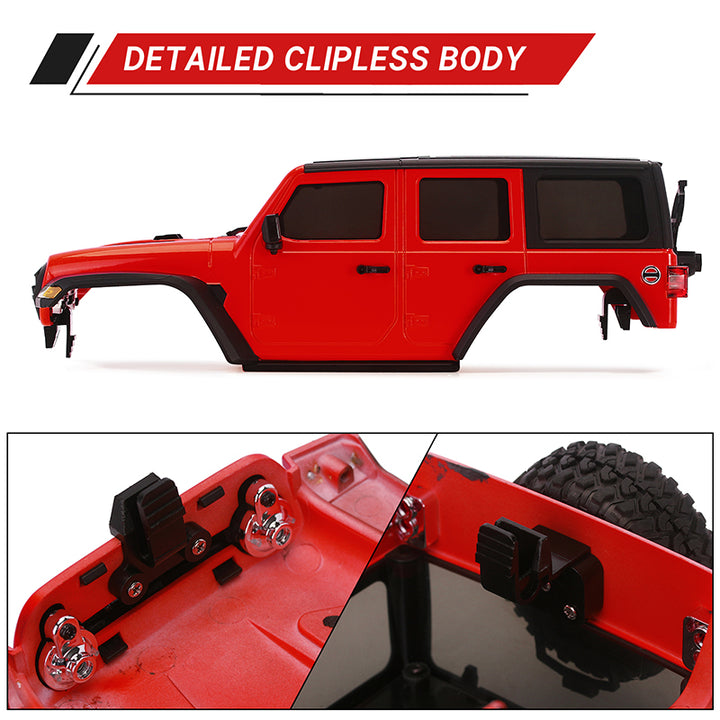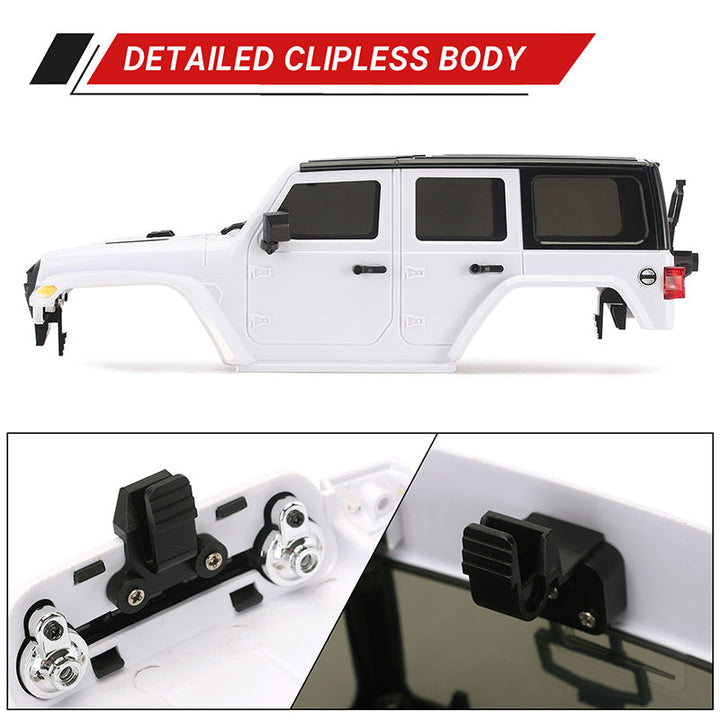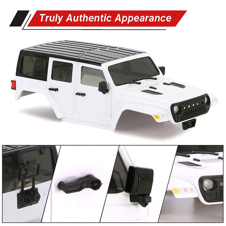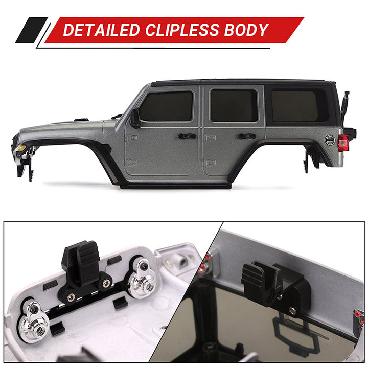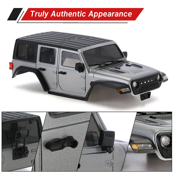 - Includes grille, side mirrors, door handles, fender flares, windshield wipers, spare tire mount, front rear bumpers, clipless mounting