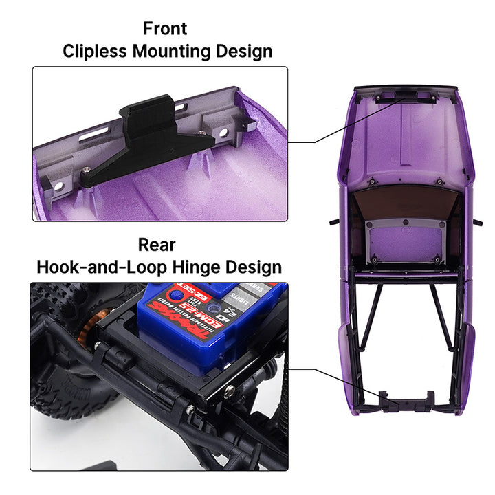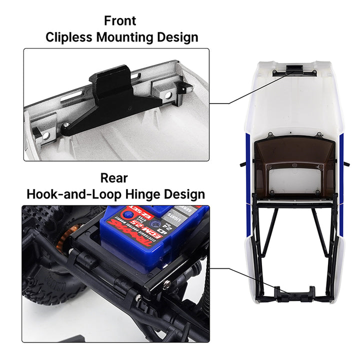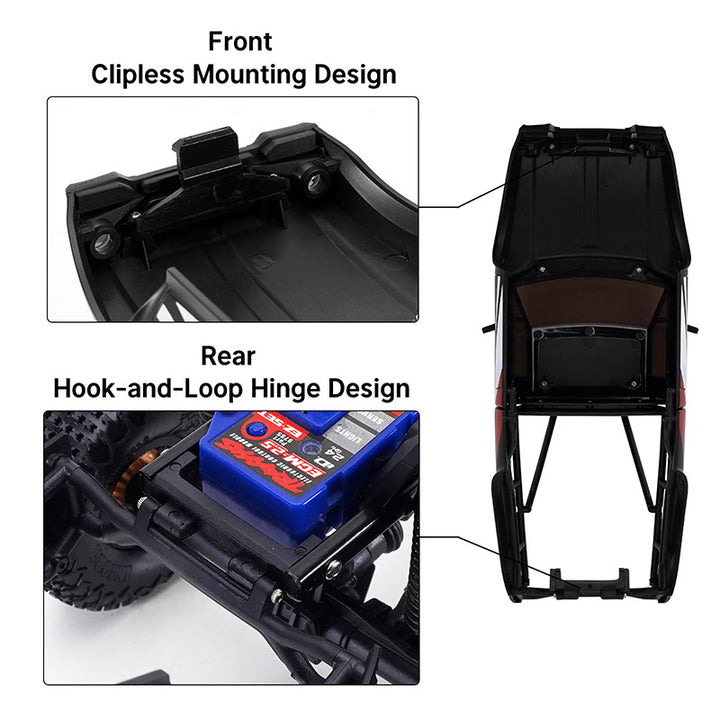 - Front Clipless Mounting design and Rear hook-and-loop hinge design. Its hook-and-loop hinge design lets you reach the chassis and battery quickly by simply swinging the body up.