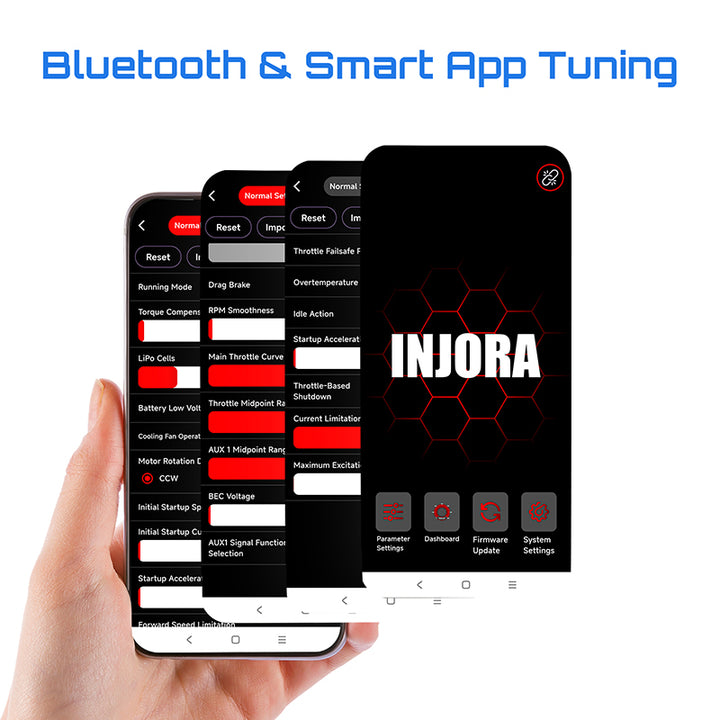 - Wireless Bluetooth & Smart App Tuning: Built-in Bluetooth for easy adjustments—no extra devices needed! Enjoy real-time tuning, data logging, and firmware updates via the INJORA Link app. (iOS: Download from the APP Store; Android: Get it on Google Play.)